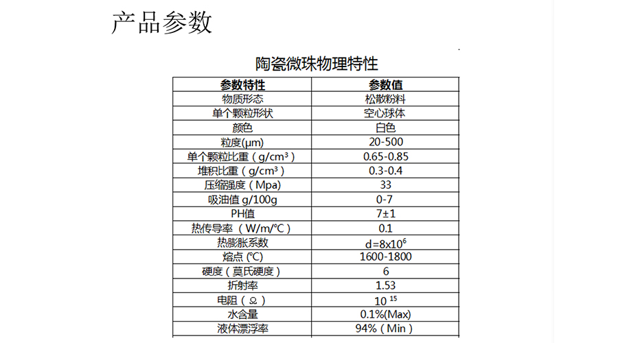 空心陶瓷微珠具有自由流動(dòng)性、高強(qiáng)度、低密度、惰性,并且在復(fù)合材料、合成泡沫、油漆、塑料、膠粘劑、玻璃纖維、密封劑、樹脂中作為輕質(zhì)填料具有廣泛的用途。兼顧重量輕、吸油率低、保溫隔熱、抗壓強(qiáng)度高等特點(diǎn),其在材料、涂料、航空航天、石油、建筑和天然氣、耐火材料、樹脂耐溫添加劑、高溫橡膠添加劑等大放異彩。