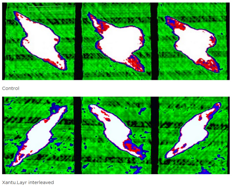 加入Xantu.Layr納米纖維增韌膜的樣件,在受到30J能量影響后,分層面積明顯減少: